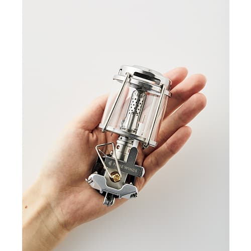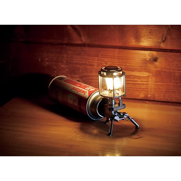 【マイクロキャンプランタン】使用時は幅7.7×奥行き9.2×高さ13.3cm、収納時は幅5.2×奥行き6.5×高さ12.2cm、重量208g。連続燃焼時間約450分(250gカセットガス使用時)。照度は150ルクス。専用EVAケース、マントル2枚が付属。