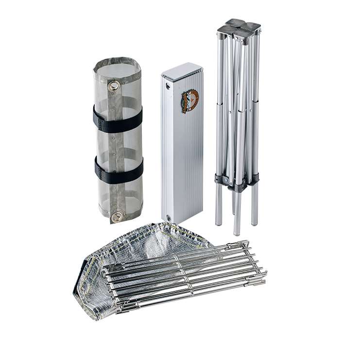 幅30×奥行き30×高さ28cm、1.45kg。収納時は幅35.5×奥行き4×高さ4cm。耐荷重20.4kg。アルミ、グラスファイバーコーティング、ステンレス。セット内容は本体、ステンレスグリル、ヒートシールド、収納ケース。中国製。