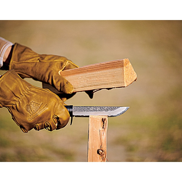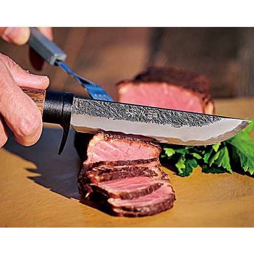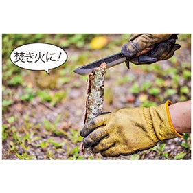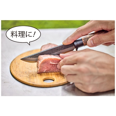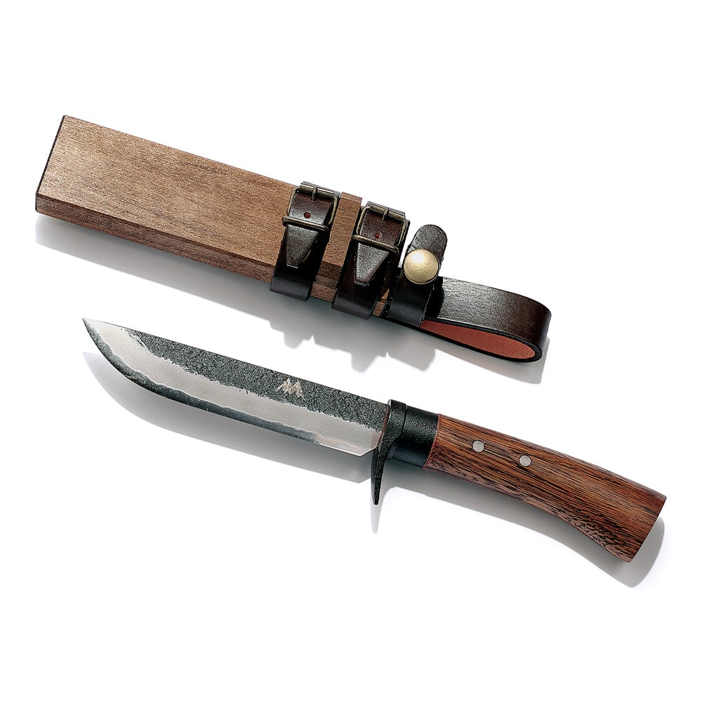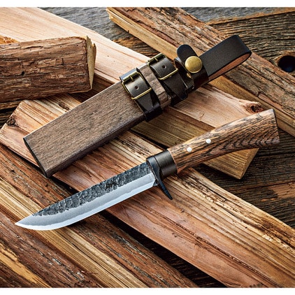 BE-PAL売れ筋のこの商品、コンセプトは「キャンパーが最初に買うナイフ」。4mmという絶妙な刃厚に注目だ。薪割りに耐えうる強度がありつつ、厚すぎないので食材も切りやすい。良質な白鋼を用いた鍛造品だから切れ味は良好。ステンレスより研ぎやすく、誰でも“育てる”楽しみを味わえる。小ぶりなのも特徴で、女性や子供でも扱いやすい。ツバには大きなフィンガーガードを設けて指を保護。ケースは木鞘、しかもボタンでナイフを固定できるから腰に下げるときに安全だ。最初の一本にして、“一生の一本”になるだろう。