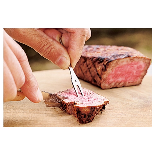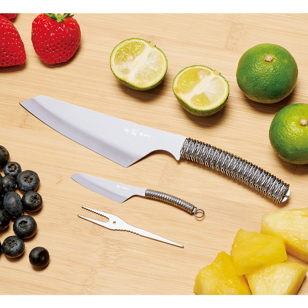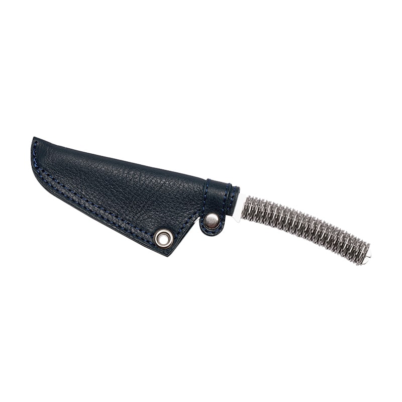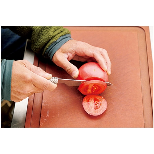 軽量で握りやすく、錆びにくい“巻き線”ハンドルで人気の「銀閃花」に、3つ仲間が加わった。ペティナイフ「手捌」は、より料理で使いやすいように刃幅を広げたモデル。刃厚は強度を高めるために、1.3から1.6mmに変更。ナイフとしては薄刃なので切れ味は鋭く、食材をきれいに薄切りできる。ULナイフ「掌」は小型化したモデルで、フチのある鉄板やクッカーの上でも食材をカットしやすい。もうひとつはミニフォークの「指叉」。「手捌」のハンドルか「掌」のケースに収まるように設計されている。3点そろえてわずか88g。スマートな料理&食事をどうぞ。