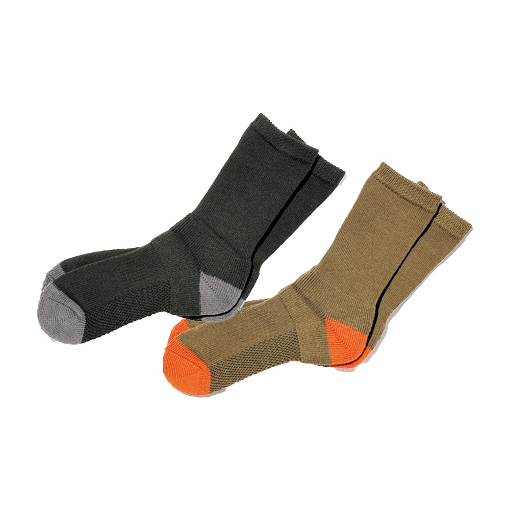 セット内容はブラック1足、オリーブ1足の同サイズ2足組。綿、アクリル、その他。丈はカカトから履き口まで約22cm。男女兼用。足首甲部のフィットパイル仕様。防汚加工。足底ビッグメッシュ。抗菌防臭能糸使用。洗濯機使用可(陰干し推奨)。日本製。