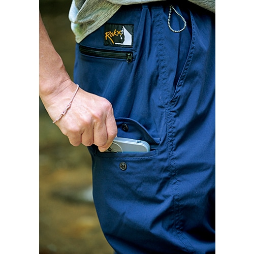 ポケットにもご注目を。スマホ用ポケットはフラップとボタンが付いていて、スマホを落としにくい。後ろポケットにパンツそのものを収納できる、パッカブル仕様なのだ。
