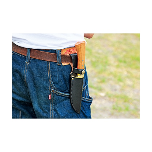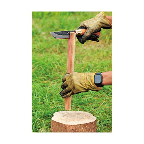 創業1946年、鍛冶屋トヨクニのデッドストック品に、オリジナルロゴをプラス。地元高知の川漁師やアウトドア愛好家に請われて製作したという剣鉈で、刃長4寸(12cm)というコンパクトさが特徴。刃は厚く、しかも断面にハマグリのようなふくらみをもたせているから、ラフに扱っても刃欠けしにくい。指を保護するツバ輪は大きめ。これらの点がヘビーユーザーたちに支持されたゆえんだ。外見も個性が光る。ツバ輪はまばゆい真鍮製、柄はつややかな山桜製。このゴージャスな刃物を、税抜き「いいはもの=11800」価格でご提供できるのは、BE-PALならでは!