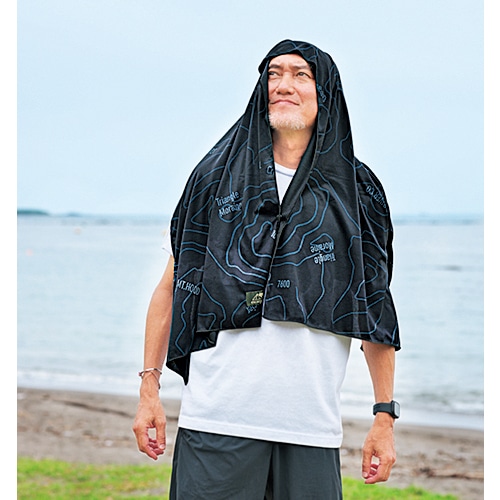 生地は独自の冷感素材「クールパス」。異形断面構造の繊維が毛細血管現象によって汗や水分をすばやく吸収し、その水分が拡散、蒸発するときに気化熱を奪う。このとき肌はひやっとした冷涼感を得るのだ。同じ生地のビッグタオルは、頭からかぶって日除けに使える。水に濡らして絞って振ってからかぶると、いっそう気化熱を奪う。熱中症対策の強い相棒だ。