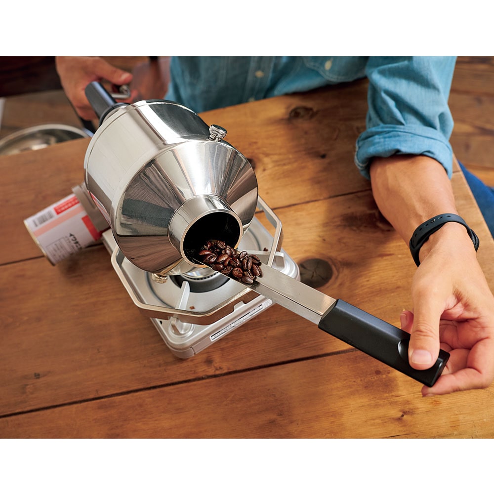 イワタニのコーヒー好き社員が、焙煎機のリーディングカンパニー「フジローヤル」に設計・監修を依頼し、3年かけて開発した。土台がイワタニのこんろにぴったり固定されるため、安全かつスムーズに手回し焙煎を楽しめる。こだわりポイントは二重式のシリンダー。熱がじっくり伝わるので、焼けムラや焦げができにくい。初心者でも好みの“煎り”に仕上げられる。