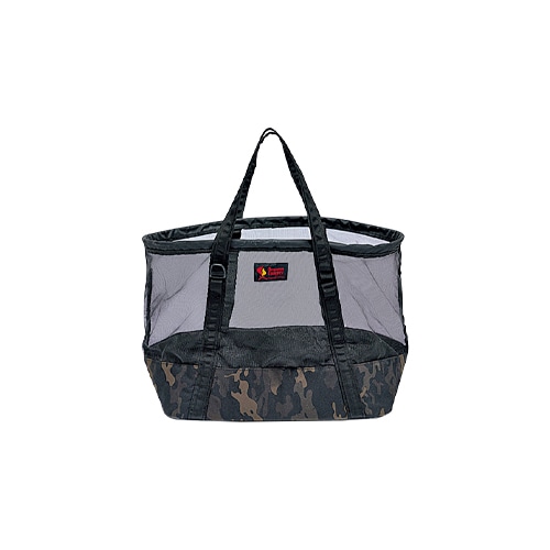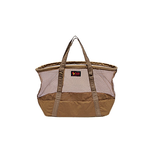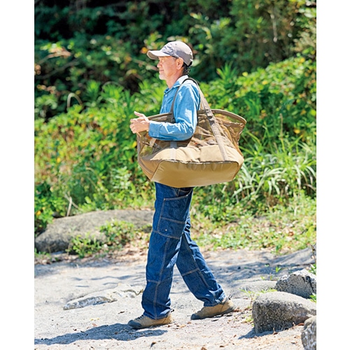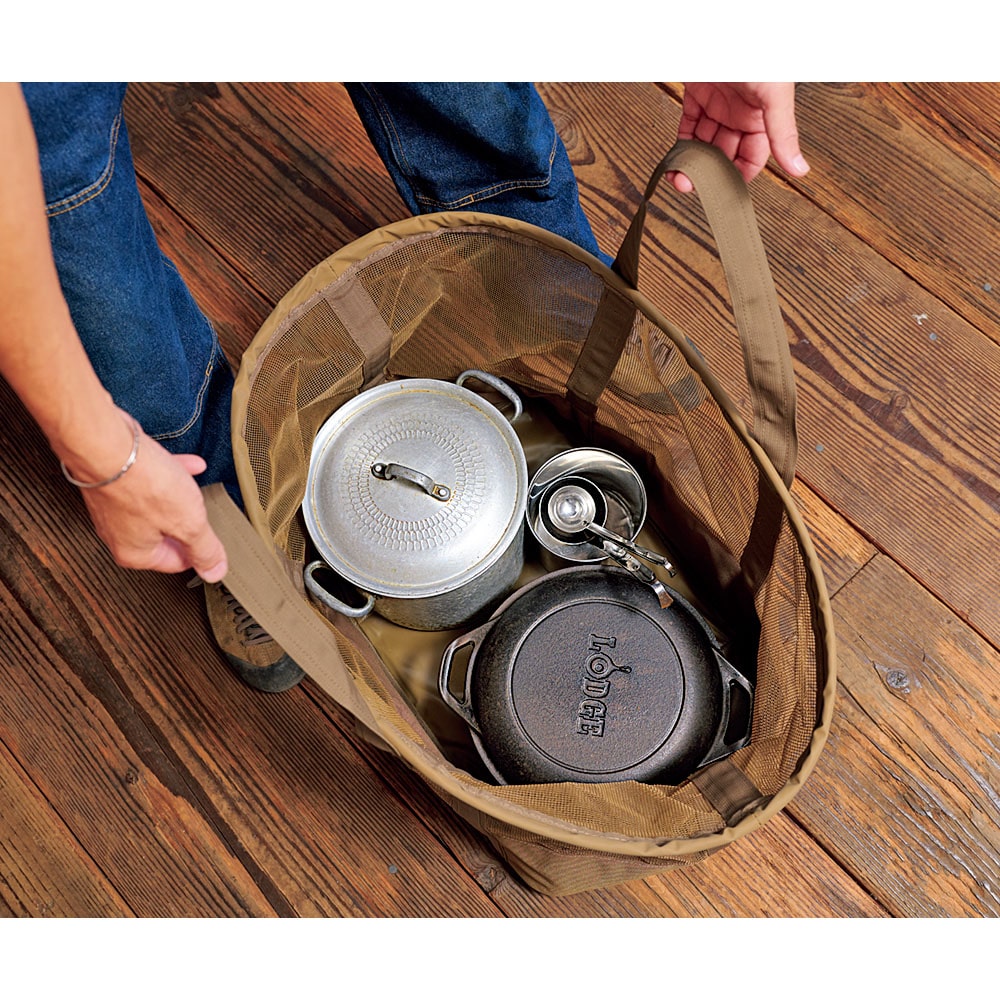 素材がメッシュというのも特徴。何を入れたかすぐ分かり、必要なものを取り出せる。メッシュはPVCコーティングだから水を吸わず、濡れた道具を入れたときに乾きやすい。底はメッシュではないから水漏れする心配もない。水洗い後のクッカーや食器のほか、雪遊びや釣りの道具の運搬にぴったり。夏が来れば海遊び、川遊びにも。出番は一年中だ!