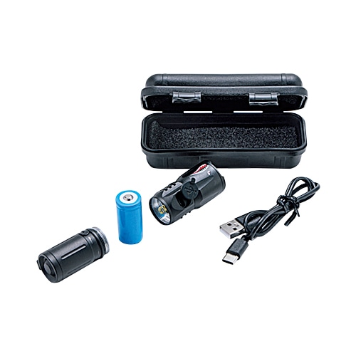 約直径2.8×長さ8.5cm、約70g。幅19.7×奥行き6.2×高さ18.2cm、約400g。素材はアルミニウム、リチウム電池、樹脂。セット内容は充電用USBケーブル(Type-C)、弾薬箱調ケース。底部にマグネットあり。前後から挟めるリバーシブルクリップあり。点灯パターンはStrong(900ルーメン)、Lowe(r 500ルーメン)、Flash(300~500ルーメン)、SOS(ボタン長押し時)の4タイプ。点灯時間は約2.5~5時間(モードにより変動)。満充電時間は約2時間。中国製。※通電後の返品不可。