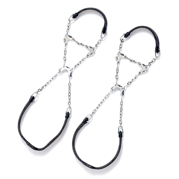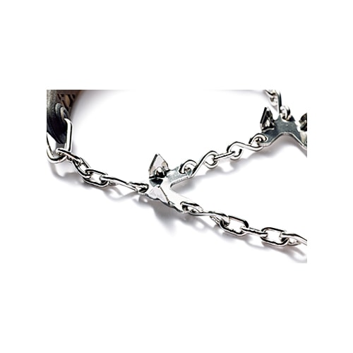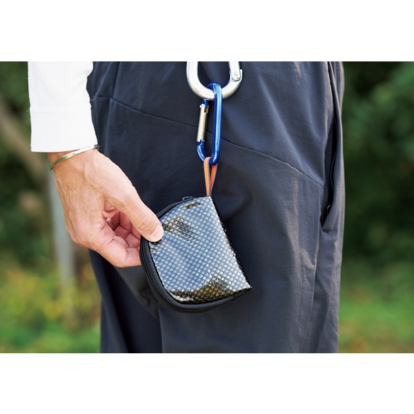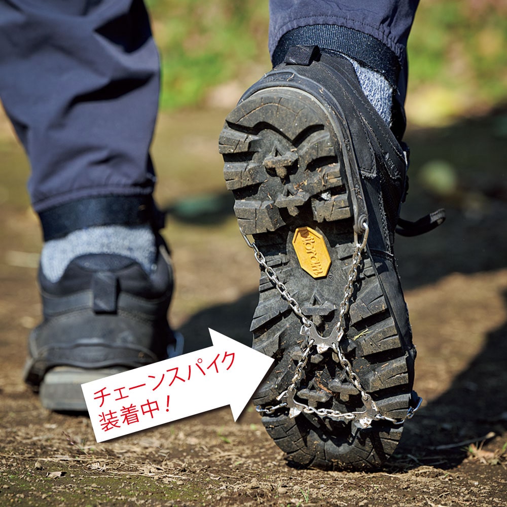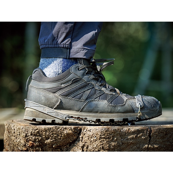 最大の特徴はなんといってもその軽量コンパクトさ。72g(M・Lサイズ)の本体がコインケースほどのケースに収まる。ベルトループにぶら下げて、滑りやすい路面が現われたらすぐに装着できるのが便利。ゴムで留めるだけなので、アイゼン用のコバの付いていない靴にも固定できる。急傾斜を歩くときは細引きなど(別売)で固定すると、さらにはずれにくくなる。