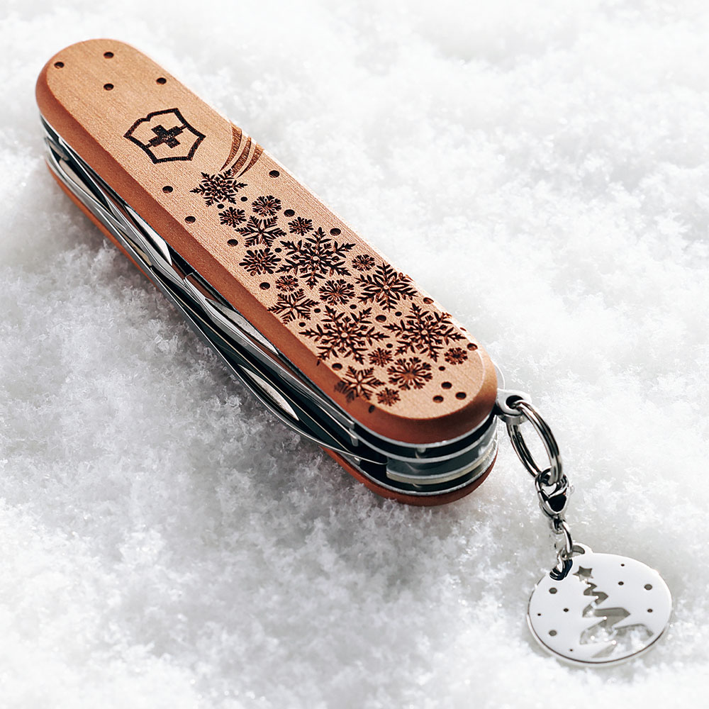 毎冬恒例、ビクトリノックスの限定品「ウィンターマジック」。今回はミドルサイズの定番「クライマー」が、ウッドハンドルになって登場した。表面には冬の夜空を思わせる流れ星と雪の結晶が刻まれて、リミテッドモデルらしいデザインとなっている。キーリングにはチャームペンダントが付いていて、取りはずしてペンダントやネックレスにすることもできる。また、梱包はスペシャルギフトボックスなので、プレゼントにするほか、コレクターズアイテムとして愛蔵しておくのにもぴったり。