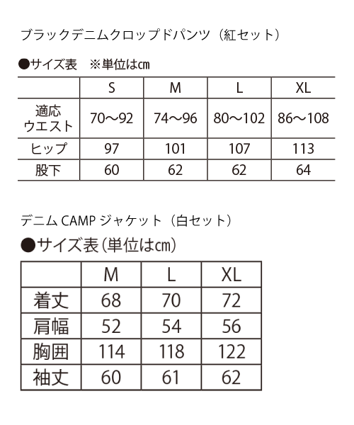 ※お選びいただいたサイズで、紅セットはブラックデニムクロップドパンツ、白セットはデニムCAMPジャケットをご用意いたします。