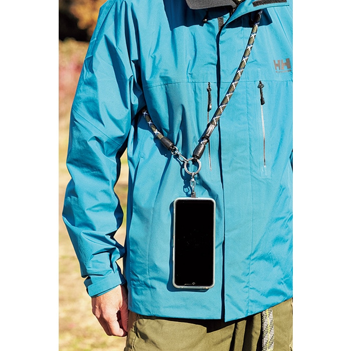 「ヨセミテストラップ」は、日本製ナイロンを用いた、クライミングロープ風のスマホ・ポーチ兼用のストラップ。強靭かつねじれが起こらず、太いから肩が痛くなりにくい。これをさらにアウトドア仕様にBE-PALがアレンジ。アウトドアウェアに似合うアースカラーとし、反射糸を織り込んで、暗闇でライトが当たると光るようにした。夜道などでも安全に歩くことができる。