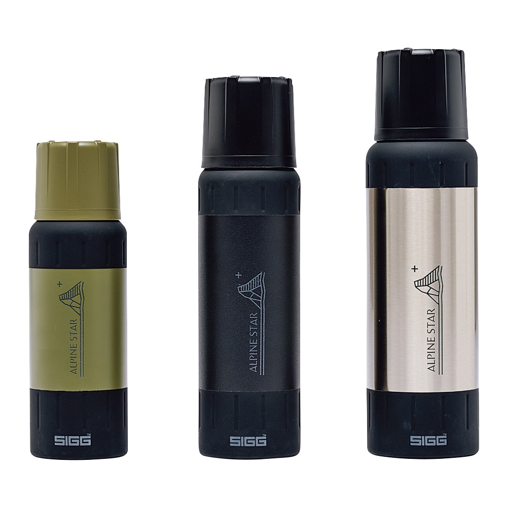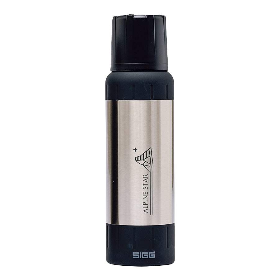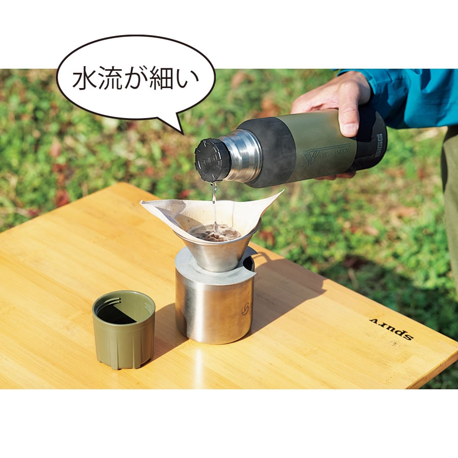 低温下での使用を想定して、真空層で熱を遮断するだけでなく、銅のコーティングで熱を内側に反射。95度Cの熱湯が6時間たっても83度C以上に保たれる(1Lの場合)。外装も山岳仕様。衝撃に強いステンレスにシリコンのグリップを巻いて、グローブをしたままでも開閉しやすくしている。底もシリコンだから、傾斜地や岩場で倒れにくい。