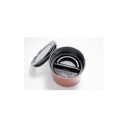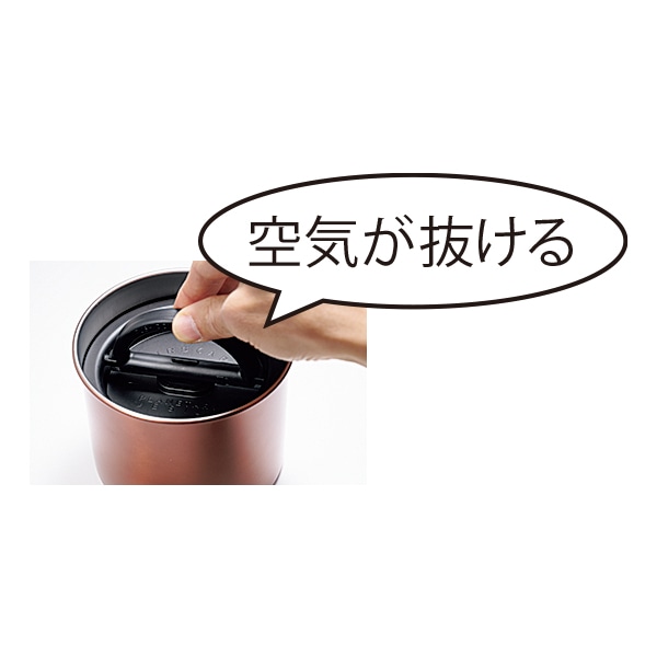 セット内容は本体、外蓋、内蓋、収納袋。Sサイズは約直径13×高さ10.5cm、約380g。容量約900ml(コーヒー豆1/2ポンド、約220g収納可)。本体はステンレス、蓋はPPとシリコン。中国製。