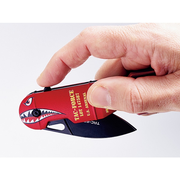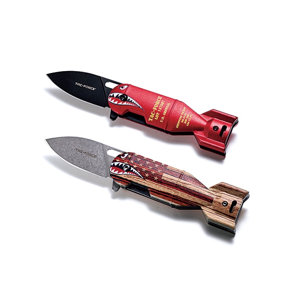 ノーズアートとは、米軍の兵士たちが航空機のノーズ(機首)に描いたイラストのこと。機体の目印であり、戦意を鼓舞するものでもあった。シャークマウスも定番のモチーフで、2つのナイフにはタイガーシャーク(イタチザメ)が描かれている。魚雷型ボディーは、腹と尾、どちらを下にしても立てて置けるのが特徴。飾っても楽しい。