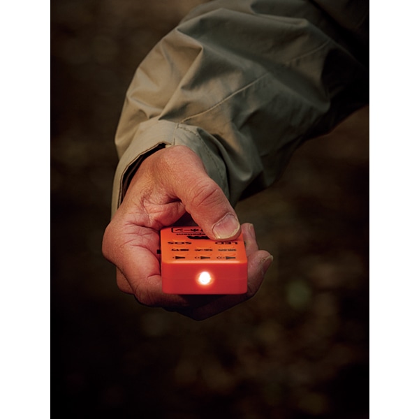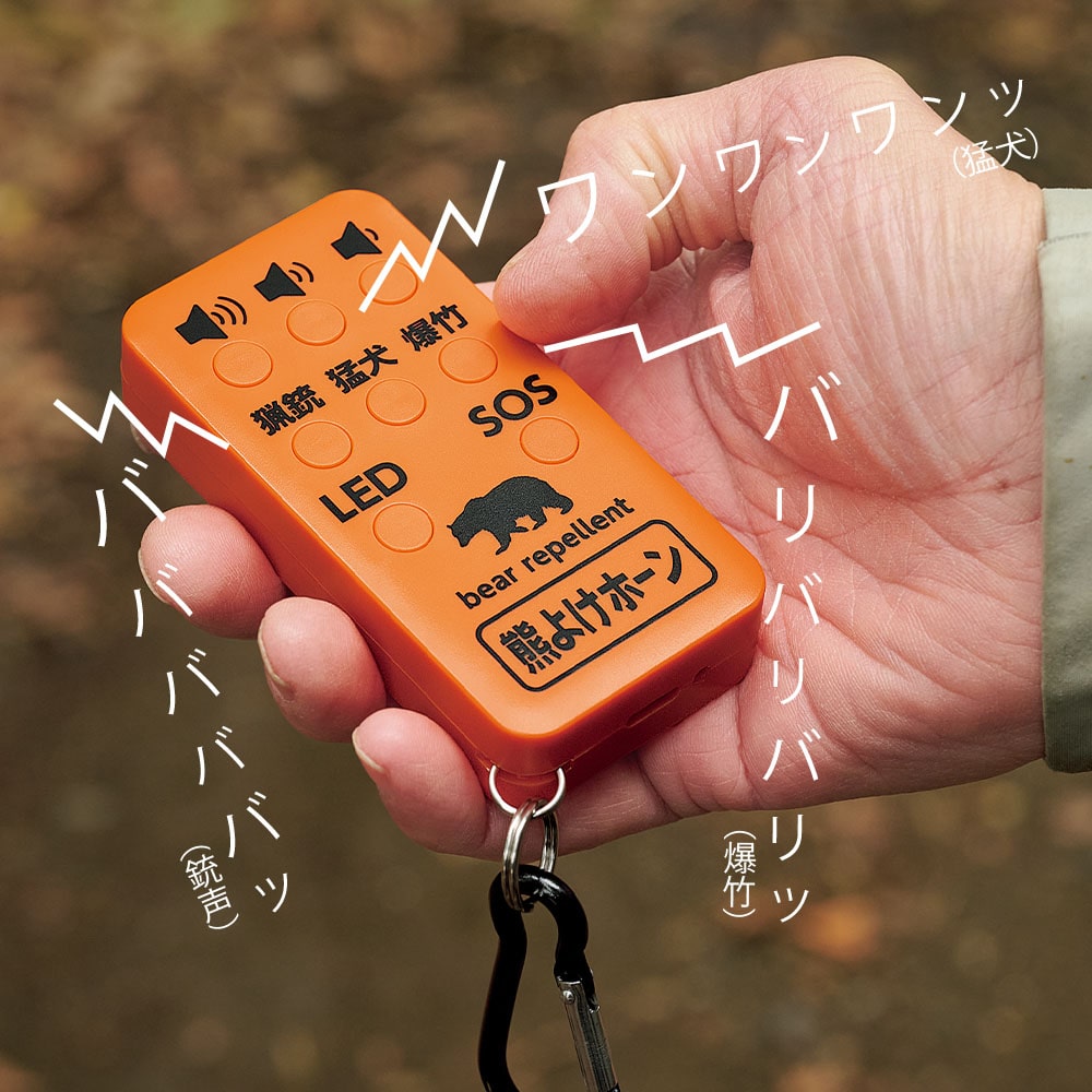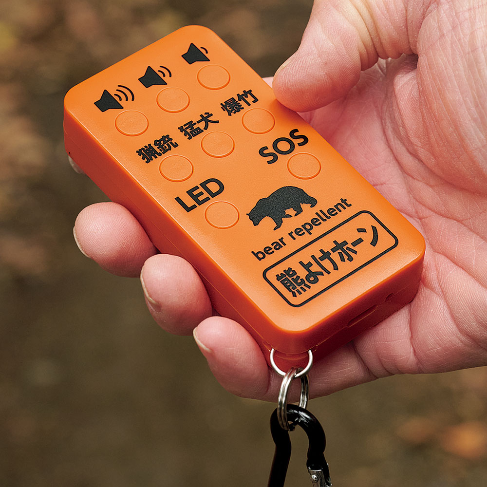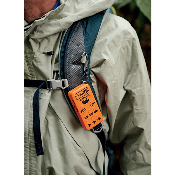 一般的な熊鈴はストッパーを付けないかぎり鳴りっぱなし状態だが、この製品はボタンを押すと鳴り続けて、再び押すと止まる。熊が出そうな場所だけで作動させることができて便利だ。最大110dBの音量はクルマのクラクションに匹敵する。大型の熊鈴に比べて軽いのがありがたい。3種の音を使い分けられるのも心強い。付属カラビナでベルトループやバックパックに装着して歩きだそう。