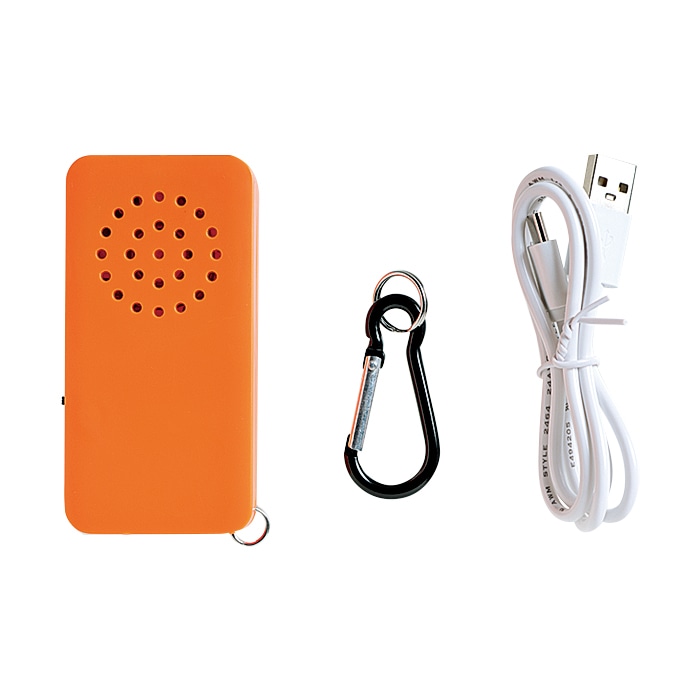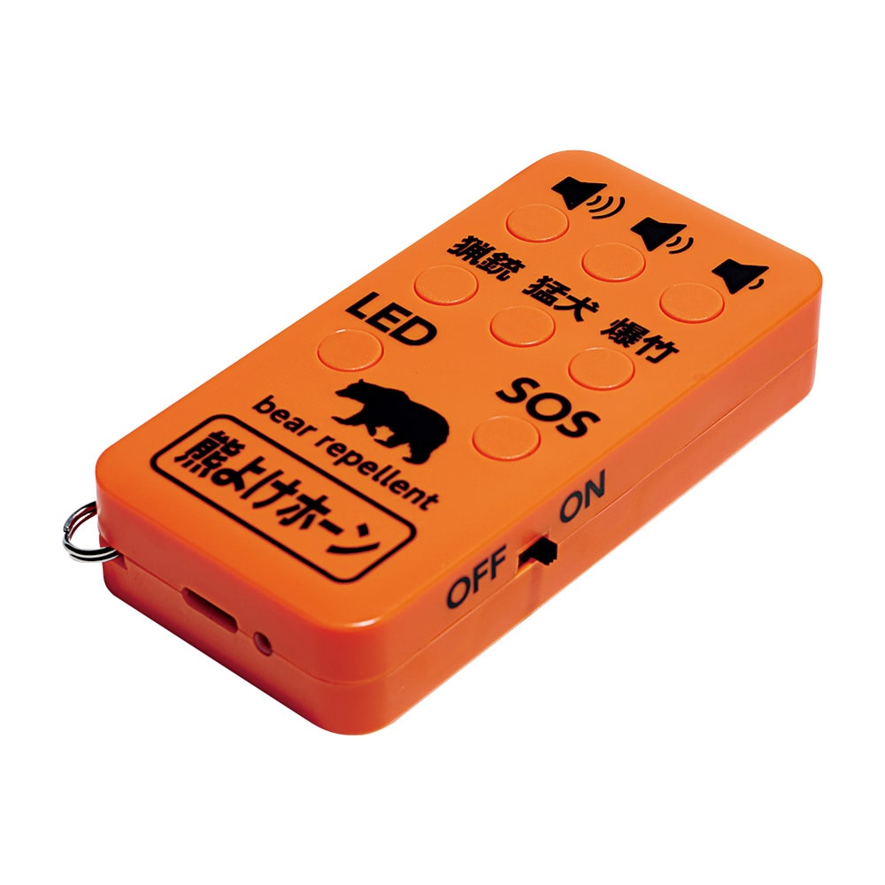 約縦9×横4.5×高さ1.85cm。約59g(カラビナ含む)。ABS樹脂ほか。連続作動時間は最大約10時間(使用モードにより変動)。電源は内蔵充電池。満充電時間は約2時間。電池寿命は約500サイクル(残量50%時に100%まで充電の場合で目安は約3年)。音圧レベルは最大約110dB。カラビナ、USBケーブルが付属。中国製。※熊の忌避を目的とする製品ですが、完全な防除を保証するものではありません。