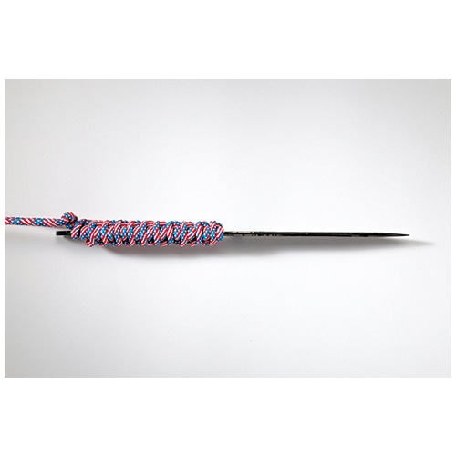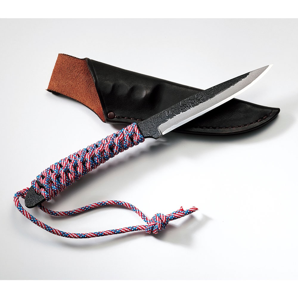 約全長23.5cm、刃長11cm、刃厚0.3cm、約100g。ブレードは土佐オリジナル白鋼(黒鎚目表面仕上げ)、フルタング構造。両刃。ハンドルはパラシュートコード巻き。牛革製の鞘が付属。日本製。※正当な理由なく刃物を携行することは違法となります。