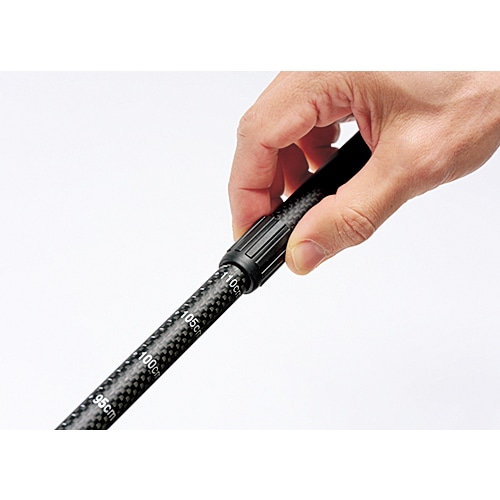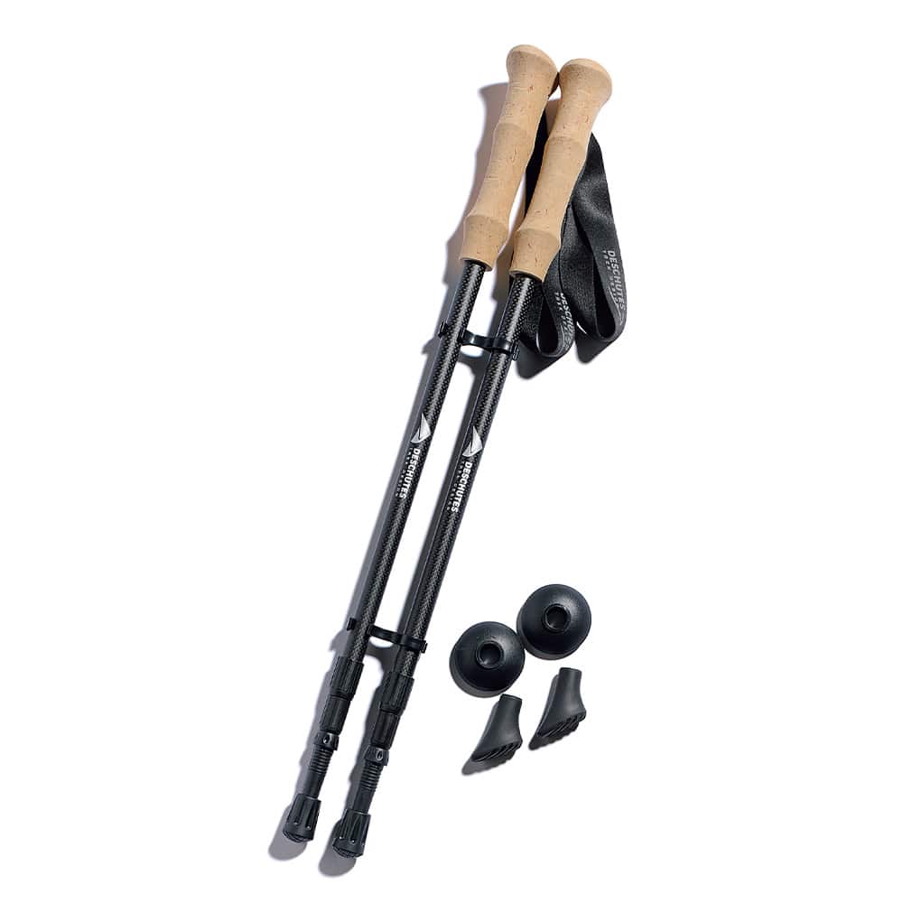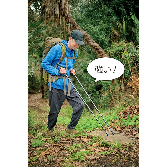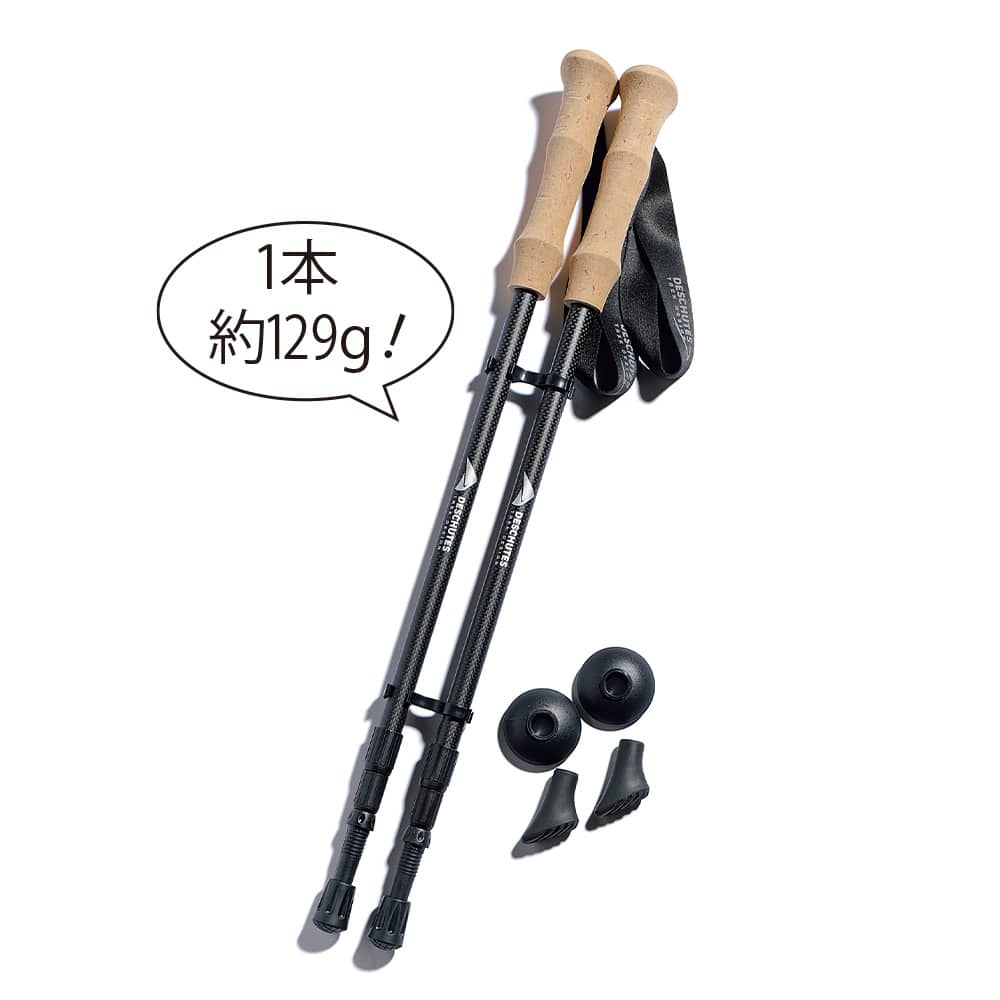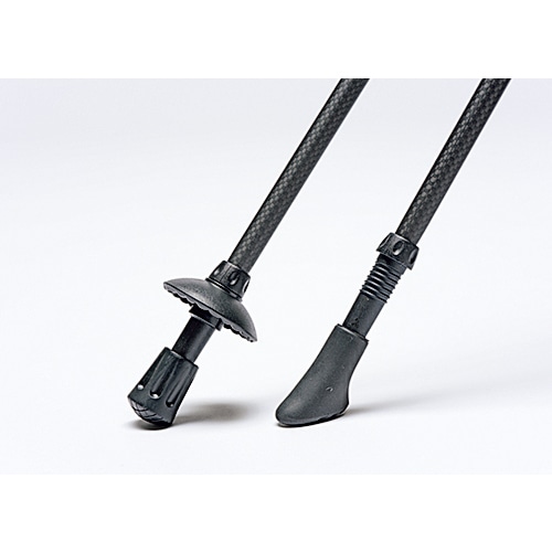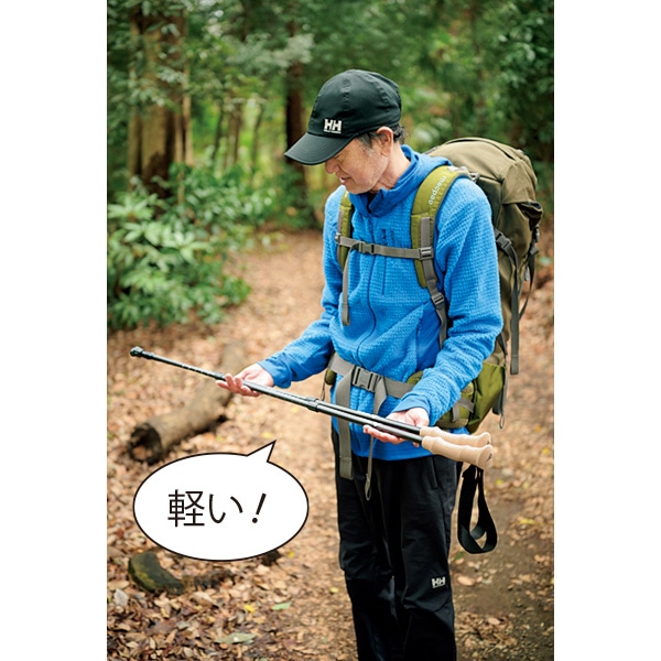 シャフトは軽さと強さをあわせもつ3Kカーボン※ 。収納方式は手早くしまえる伸縮式で、回して固定するタイプだから長さ調節も簡単。石突きに付けるキャップは2種。斜めタイプは路面にフィットし、腕力を利かせてグイグイ歩ける。失くしたときの予備としても助かる。バスケットは泥や浅い雪、岩のすき間に埋まるのを防ぐ。収納袋も付いて、コスパ最高のトレッキングスターターセットだ。