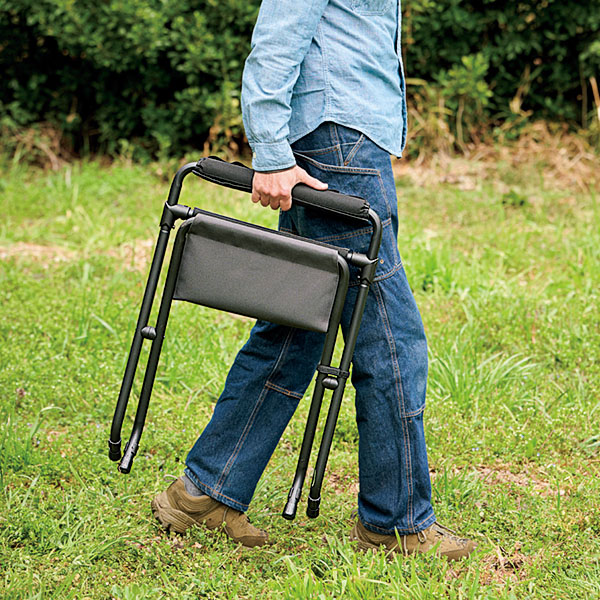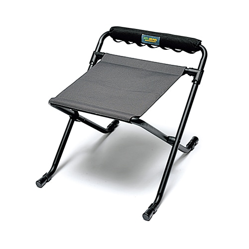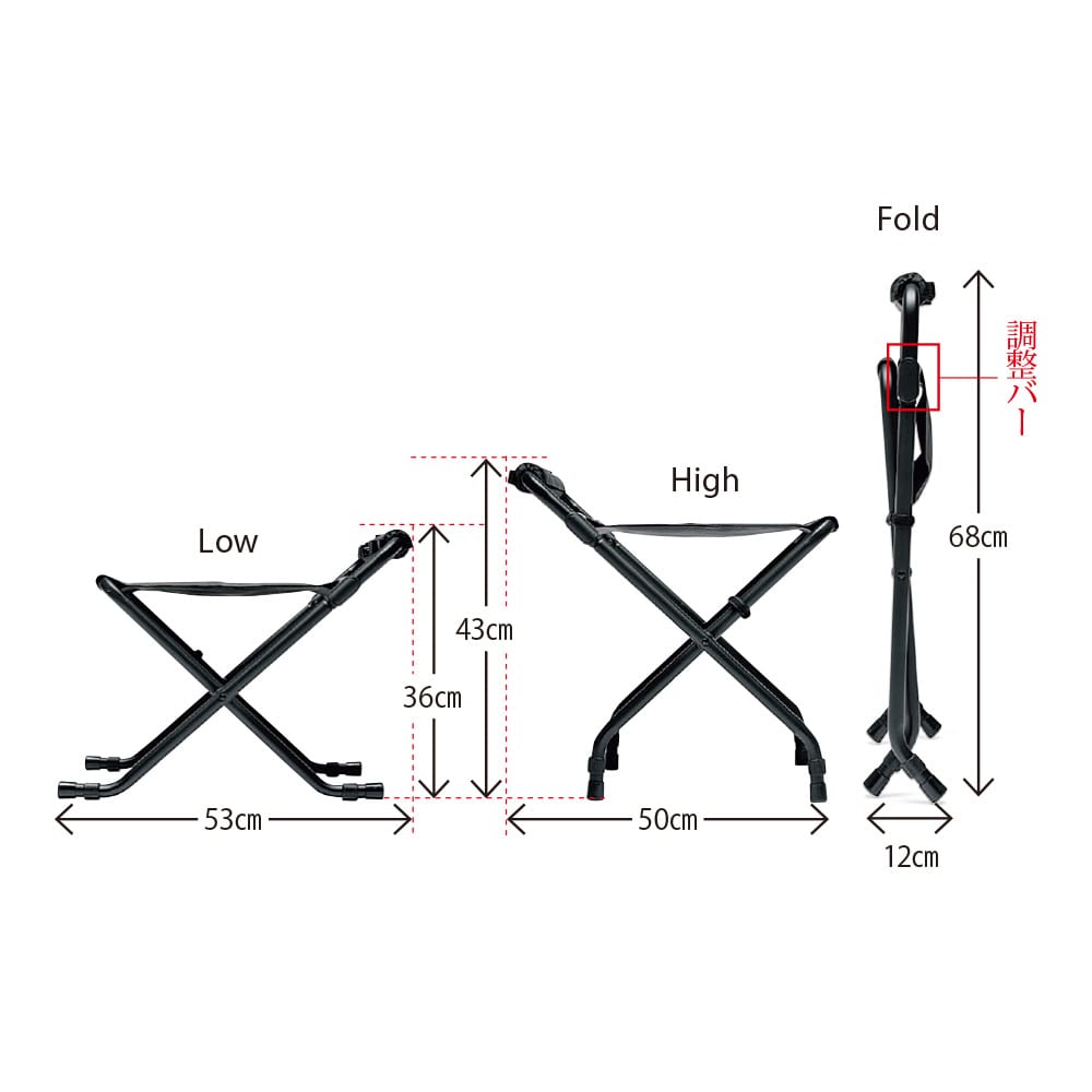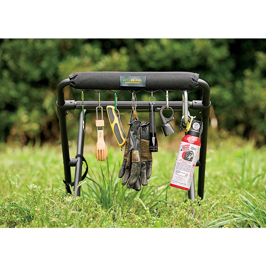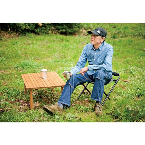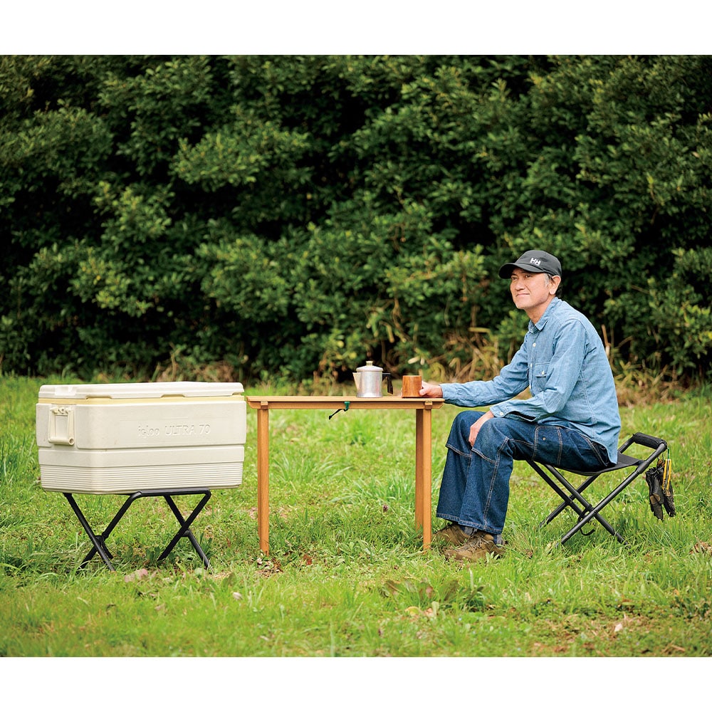 フレームを開く向きによって高さが変わる。この動きが超なめらか!座面が広くて座り心地も良い。耐荷重100kgだから安心して体重を預けられる。ハイで食事をしたり、ローで焚き火をいじったり。クーラースタンドにもちょうどいい。ギアループを活用すればテーブルやクーラーまわりを整理できる。45周年記念タグを付けた限定品だ!
