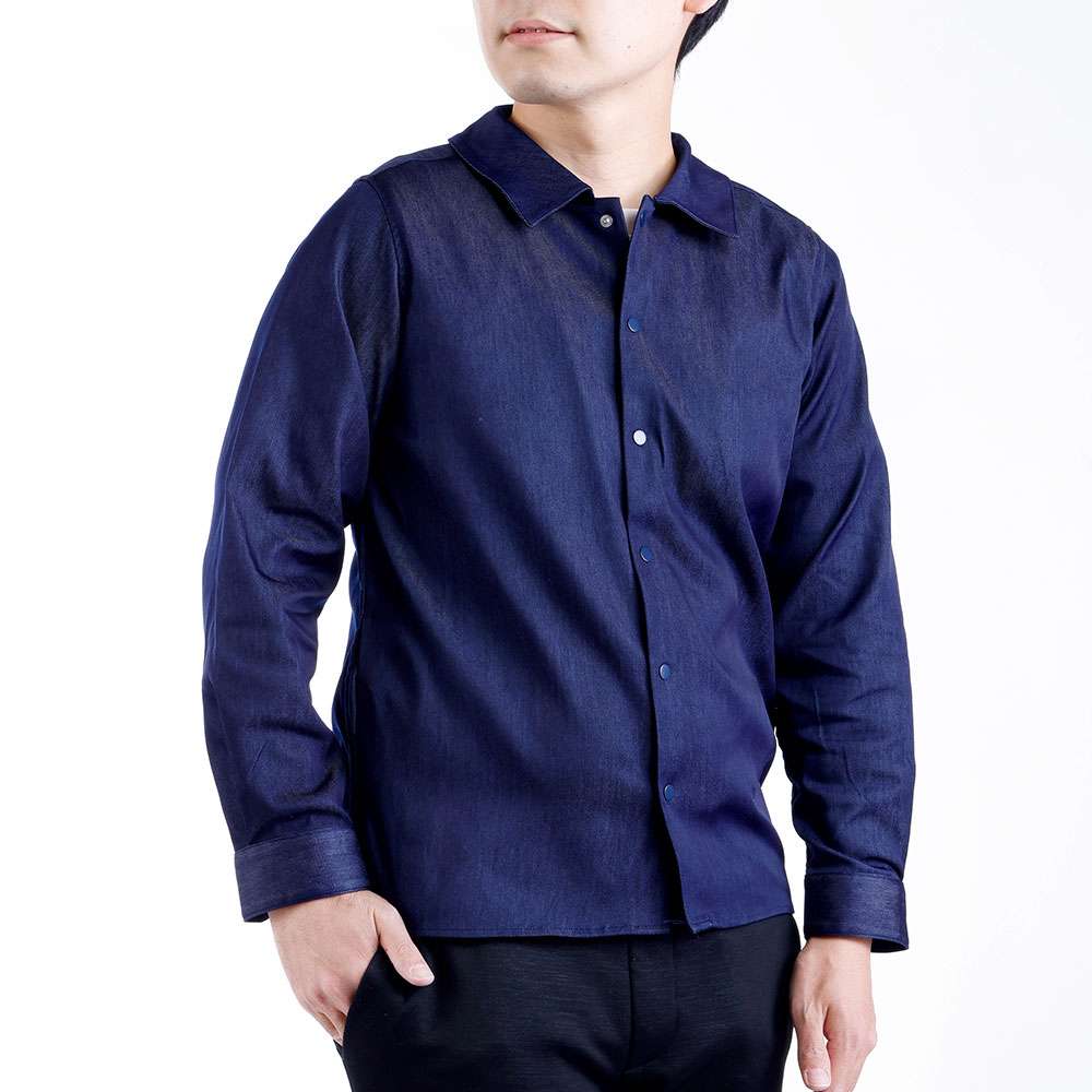 綿ではなくナイロンでデニムを織る、つまり高密度なナイロンデニムは、少々の雨なら弾いてしまう撥水性と、洗濯しても部屋で3時間ほど干すだけで乾く速乾性を持つ。しかも皺になりにくく、生地の張りが損なわれにくいという、まさにシャツにうってつけの素材なのだ。さらにストレッチ性を備えるなど、多彩な機能性を持つ次世代シャツが完成した。