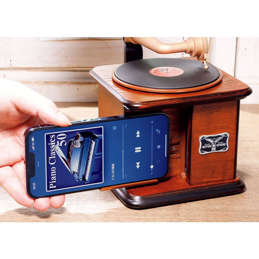 持ち運びやすい小型サイズで電源不要。使うごとに味わいが増す銅製のラッパから流れる心地よい音を楽しめる。木目調仕上げの質感は、和洋どちらのインテリアにも合う。