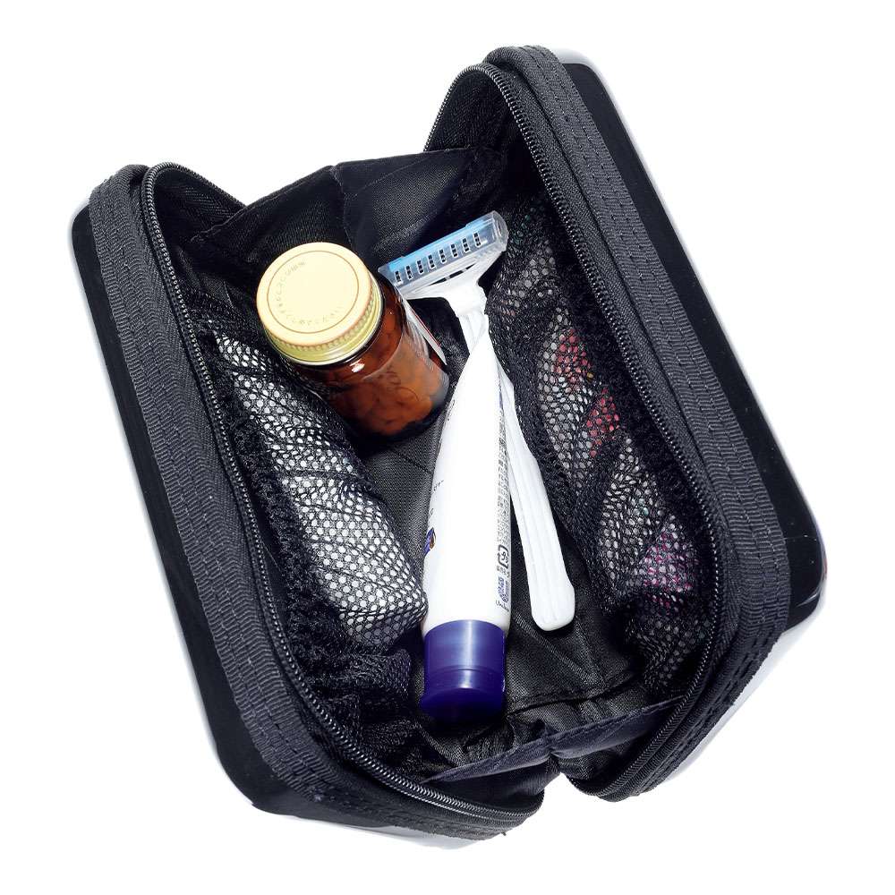3種類のポーチは、ケーブル類やアメニティグッズ、イヤホンなどの小物をきれいにまとめて収納可能。ポリカーボネイト製なので衝撃から収納物をしっかり守るタフな作りだ。チューブタイプの化粧品や薬など、外からの衝撃に弱いものを入れるのにも重宝する。