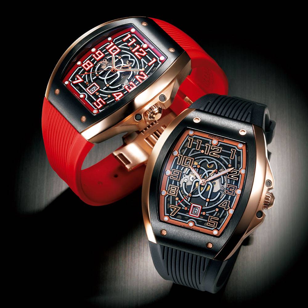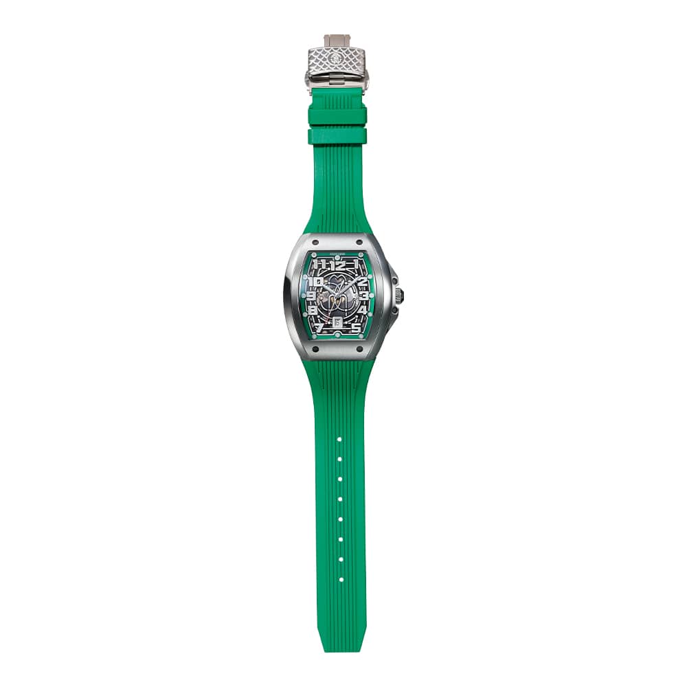 その新作として発表された本機は、「フランク ミュラー」の代名詞であるトノウ型のケースに、スケルトン仕様の文字盤を組み合わせている。中央にロベルト カヴァリのブランドロゴを配したメタルフレームにアップライトインデックスを配置、その奥に自動巻きムーブメントがのぞく立体的なデザインで見る者を魅了する。