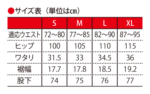 表地は綿74%、ナイロン25%、ポリウレタン1%、裏地はポリエステル100%。830g(Lサイズ)。サイドポケット×2。ヒップポケット×2。洗濯機使用可。中国製。