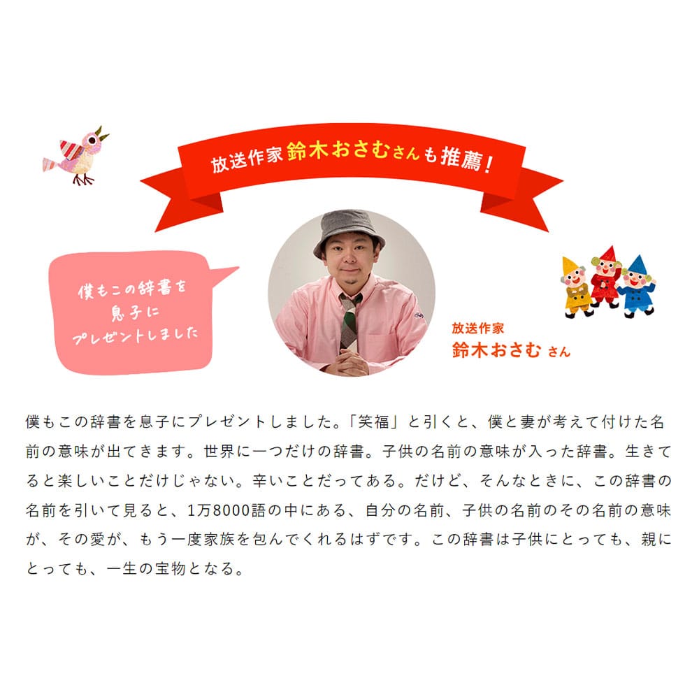子供の名前と誕生日、そして語釈として全角 40 文字までの紹介文が掲載可能で、名前の由来、好きな遊びや食べ物、将来の夢など、購入者が自由に作成。これをプロの辞書編集者と辞書校閲者が編集・校正して、辞書の項目の中に自然な形で挿入する。こちらはソフトカバーで持ち運びもしやすいミニ版のセットです。通常版は保存性を高める堅牢なハードカバー。セットのミニ版は持ち運びやすさを追求したソフトカバー仕様なります。もちろん通常版と同様にオーダー情報が掲載されます。