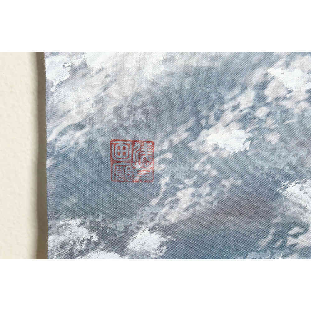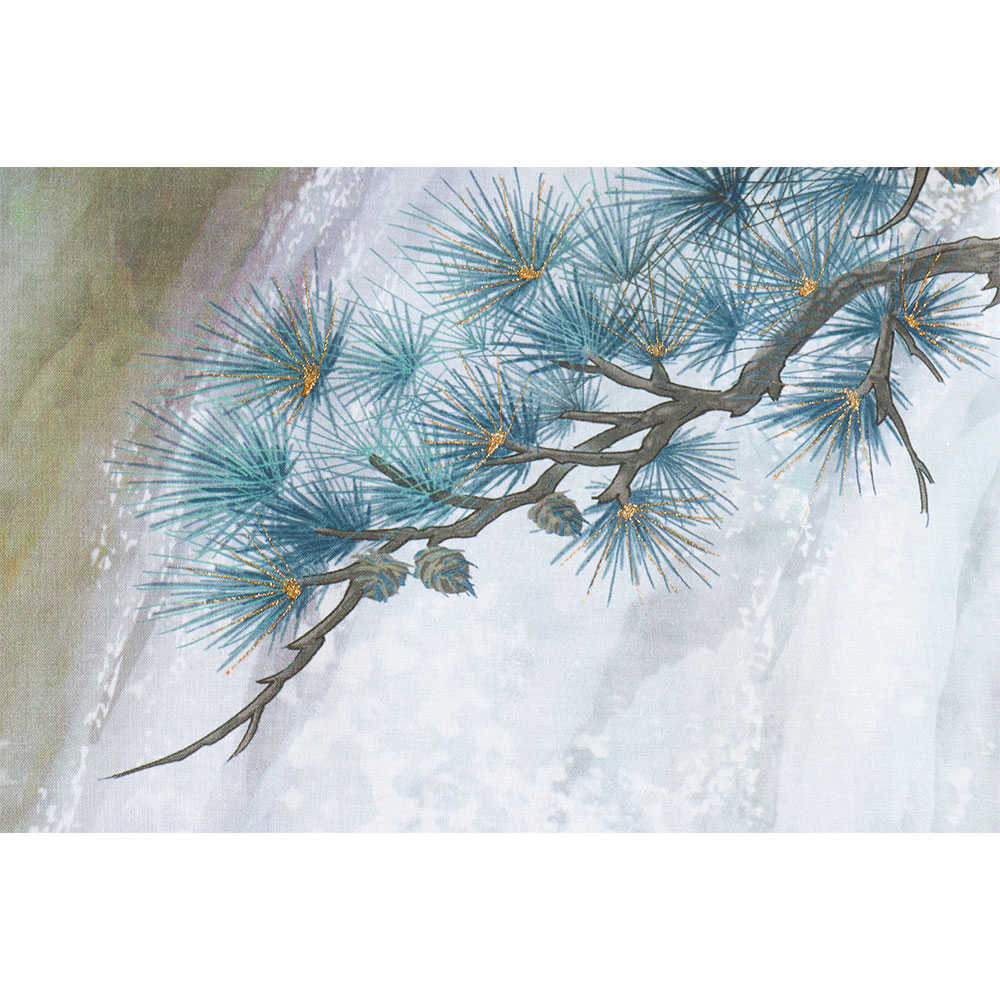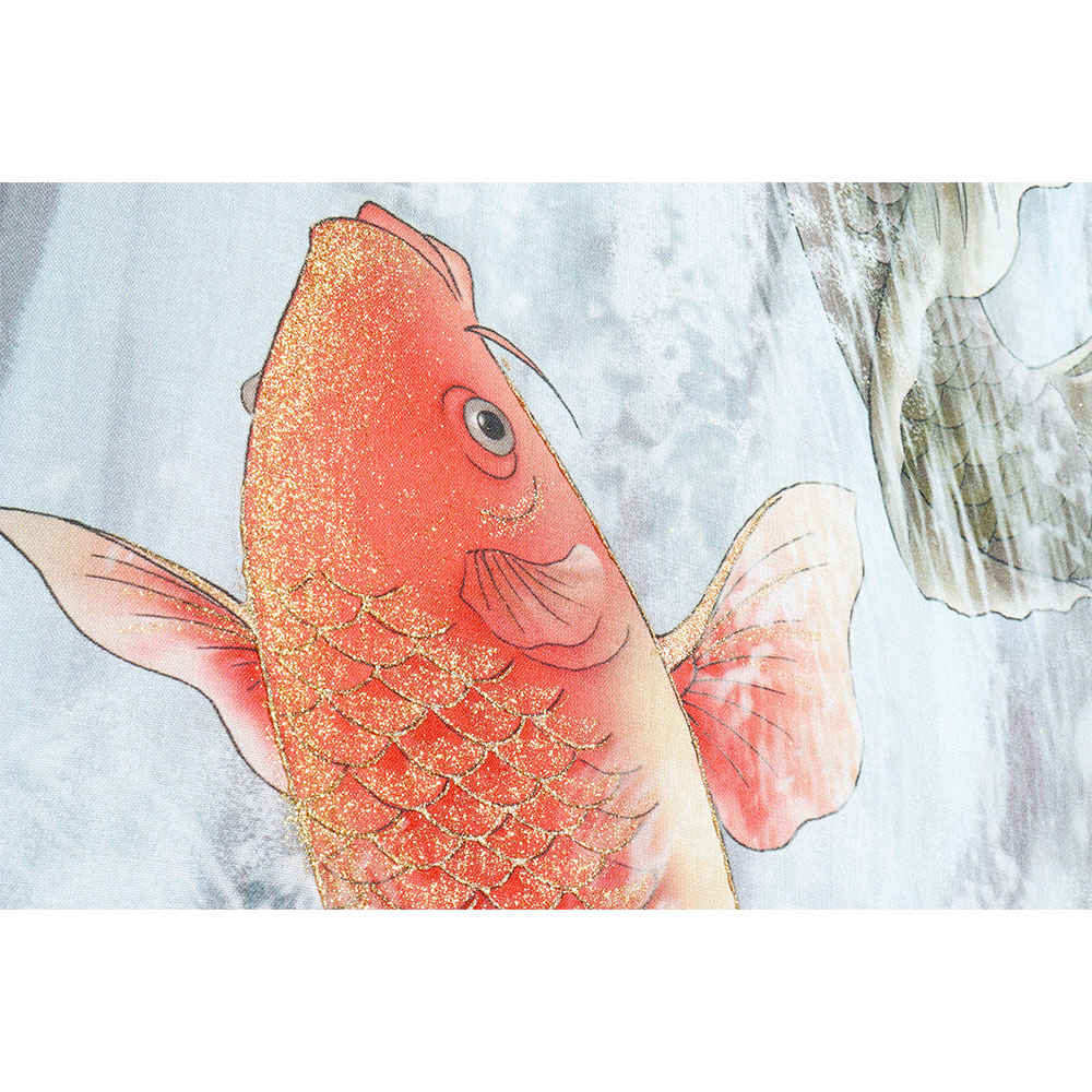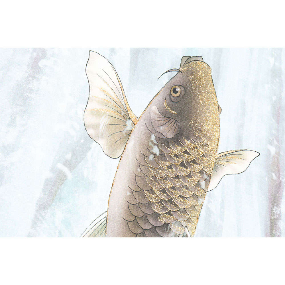 鯉と背景はプリントで表現し、その後、鯉の背と松の木に手描きで金彩を施した。