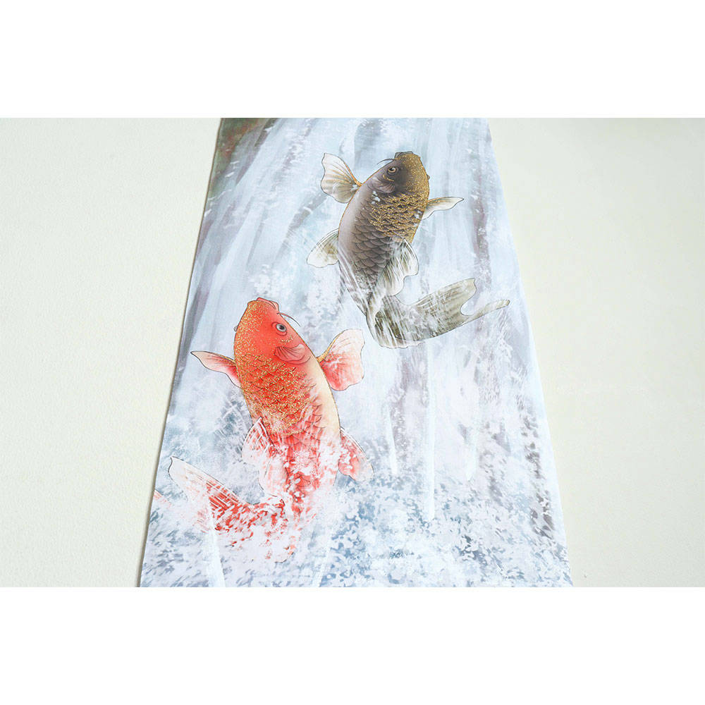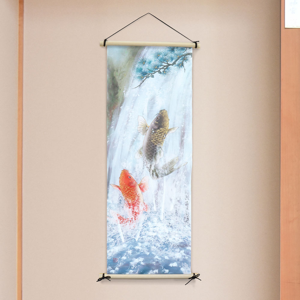 二匹の鯉が水しぶきを上げながら滝登りをする姿を描いたタペストリー。力強く、繊細で優雅なデザインだ。