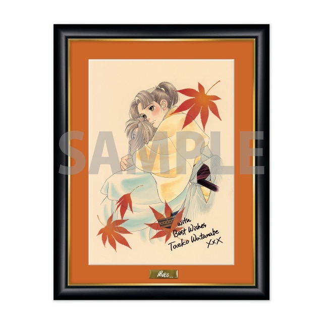 額外寸は約38.8×49.5×厚さ1.5cm。イラストサイズは約25.7×36.4cm。額は木製、アクリル。イラストは紙。プレートはアルミニウム。技法は高品位美術印刷。イラストに渡辺多恵子先生のデジタルサイン(複製サイン)入り。壁掛け用紐、取扱説明書付属。額色はブラック+面金。日本製。※シリアルナンバーは付きません。