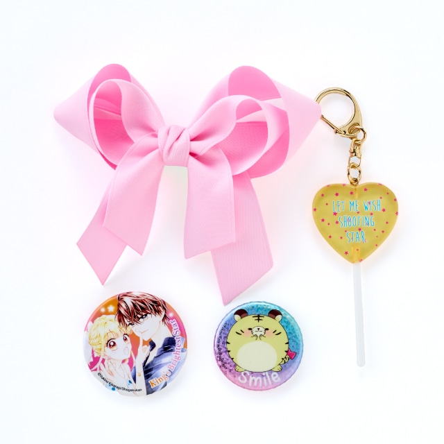 【セット内容】リボンピン(ピンク)×1 キャンディー風キーホルダー×1 缶バッジ×2
