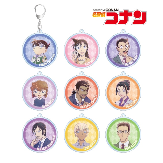 江戸川コナン、毛利蘭、毛利小五郎、灰原哀、大和敢助、上原由衣、諸伏高明、安室透、風見裕也のイラストを新たなタッチで魅力的に表現し、アクリルキーホルダーに仕上げました。
