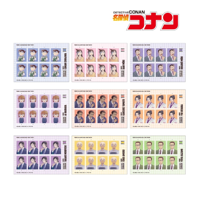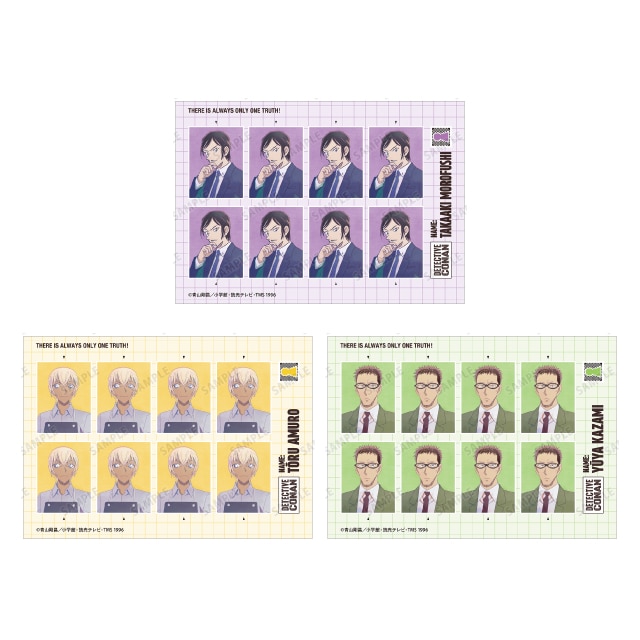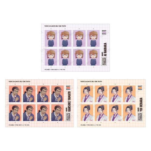 江戸川コナン、毛利蘭、毛利小五郎、灰原哀、大和敢助、上原由衣、諸伏高明、安室透、風見裕也のイラストを新たなタッチで魅力的に表現し、証明写真風のブロマイドに仕上げました。