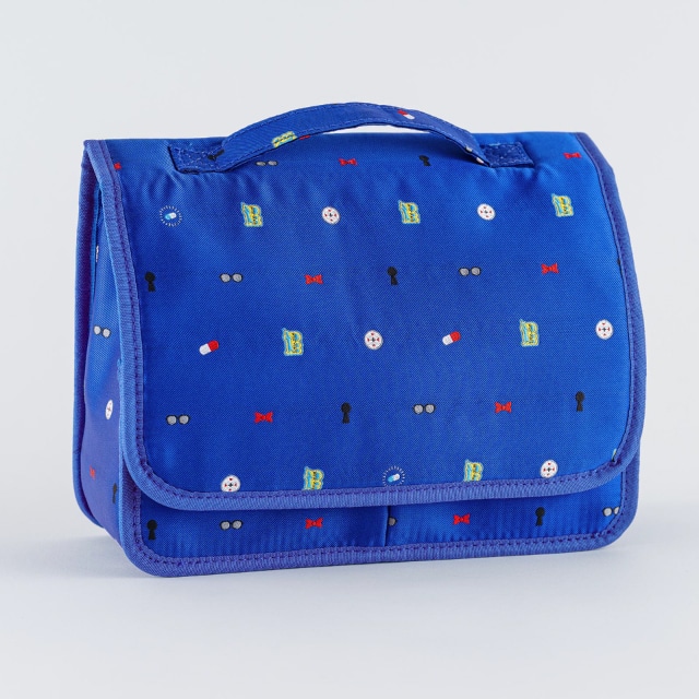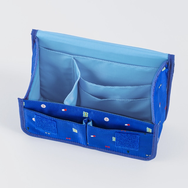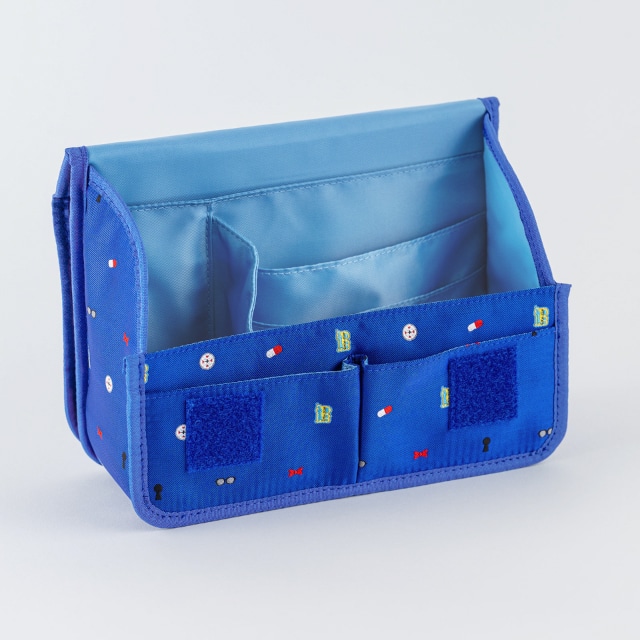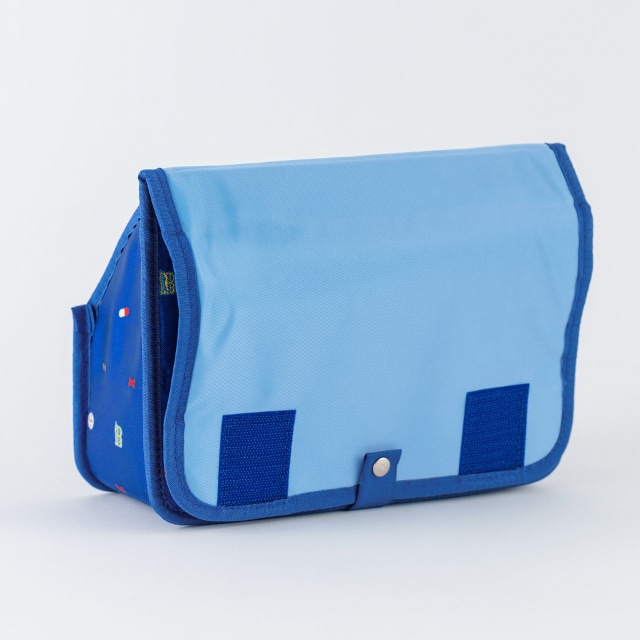 デスク周りの細々したアイテムをたっぷり収納できる、自立タイプのポーチです。