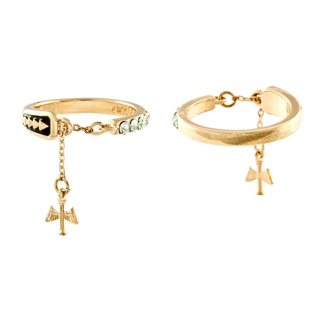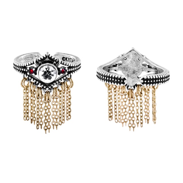 ひげをイメージした金色のチェーンが揺れ、赤いストーンのアクセントが、戦士の誇りと力強さを象徴します。