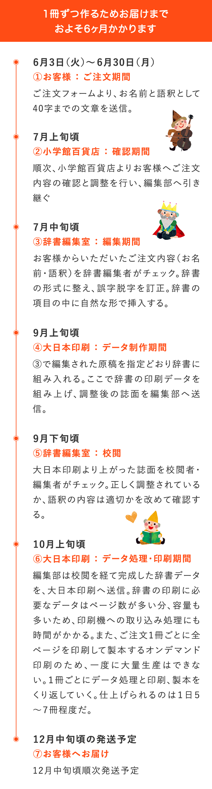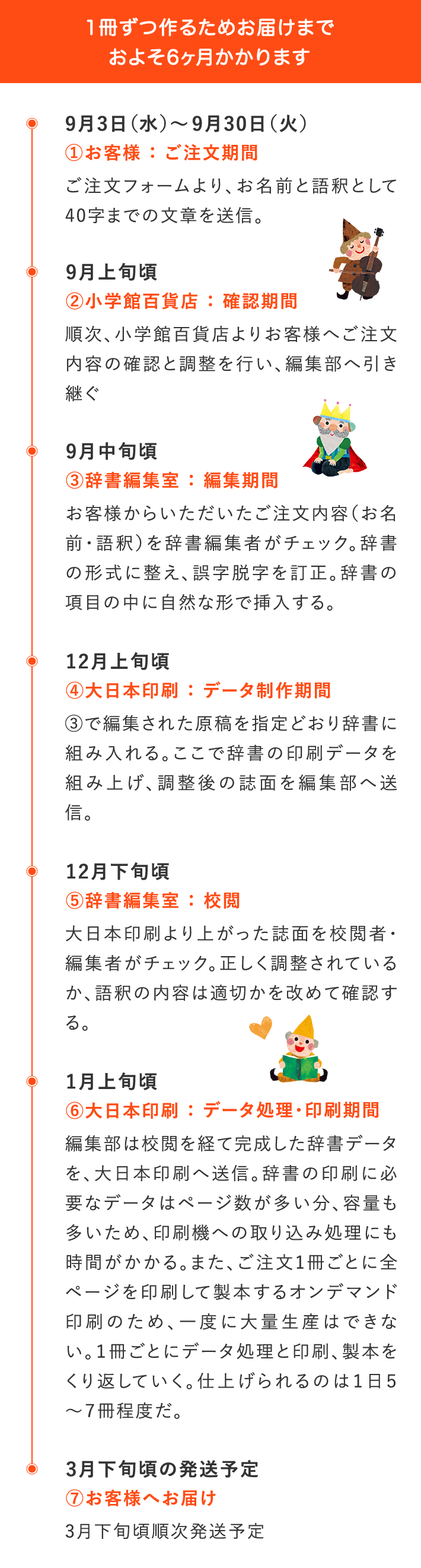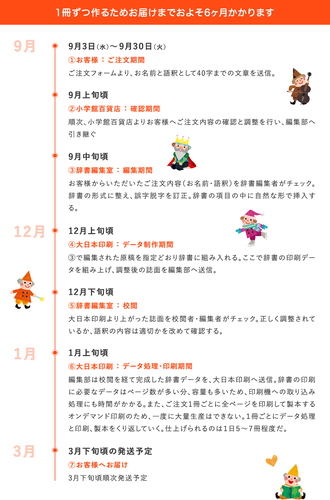 辞書編集部と大日本印刷が10年かけて共同開発した仕組みで印刷・製本。世界に一冊だけの特別版『きみ辞書』が完成する。通常版『小学館 はじめての国語辞典』の表紙は赤茶色だが、この特別版は10色から自由に選ぶことができるので、よりスペシャルな仕上がりを実感できる。さらに巻末の奥付(編者や発行者が記されるページ)にも子供の名前が入る特別仕様となる。